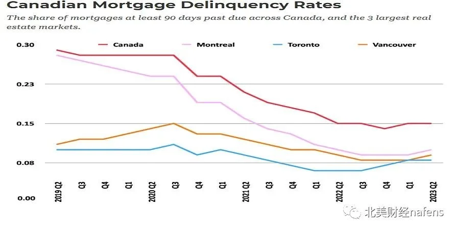 从全国抵押贷款违约率来看,加拿大 99% 以上的抵押贷款持有人信誉良好。这个数字明显高于美国和其他发达国家经济体。