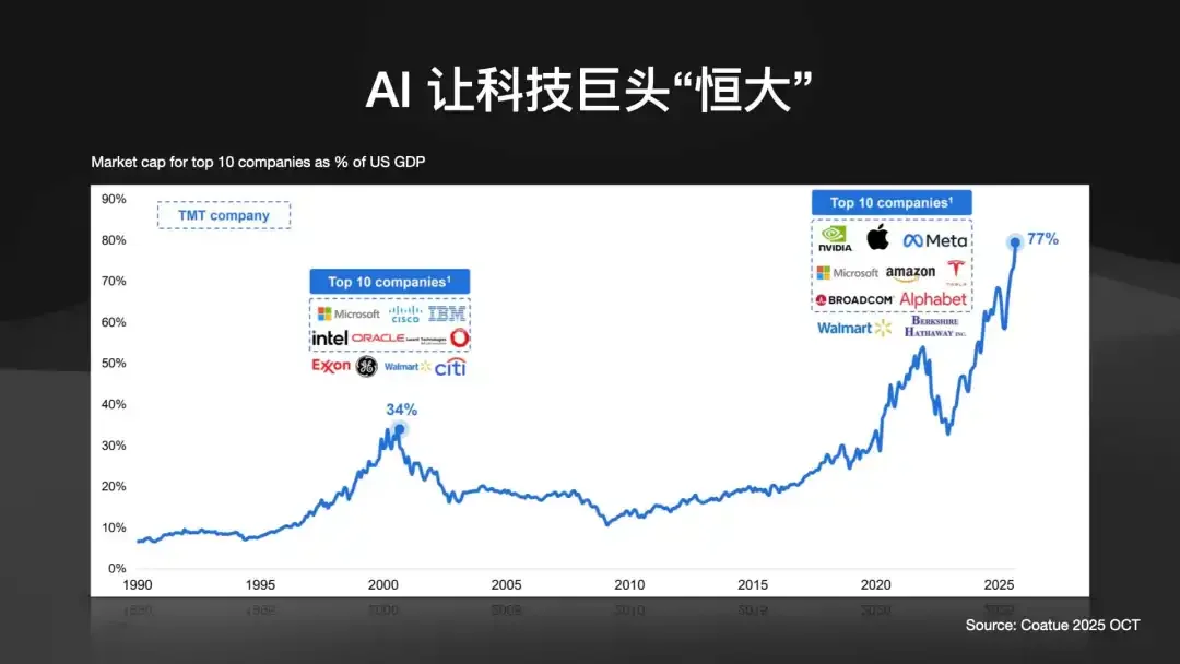 这导致了巨头“科技七仙女”(Mag 7)的空前集中。2000 年 .COM 泡沫顶峰时,美国最大的10家公司市值加起来,约等于美国 GDP 的 34%。而今天,这个数字是 77%。
