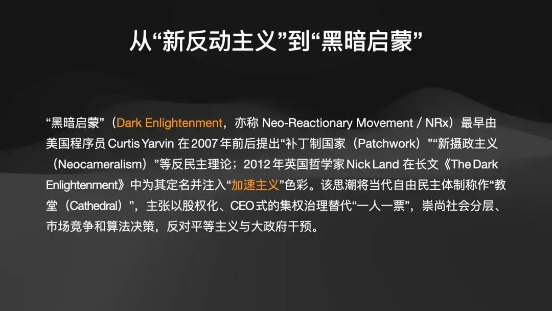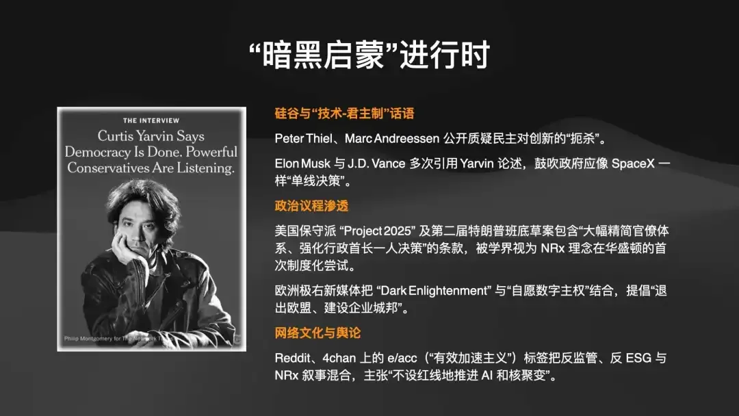 从1992年互联网的信条“我们只相信共识和运行的代码” 开始,一种“黑暗启蒙”思想(又称加速主义)正在硅谷蔓延。它主张反民主,用 CEO(像川普那样)来治理国家,用算法代替投票,本质上是一种技术驱动的社会达尔文主义。