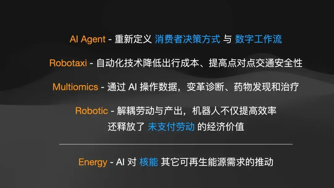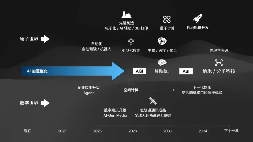 未来十年的时间轴(2025-2035): 数字世界(Agent -> 空间计算 -> 脑机接口) 与物理世界(自动驾驶 -> 核能 -> 生物医疗 -> 量子 -> 太空开发) 将同时爆发。