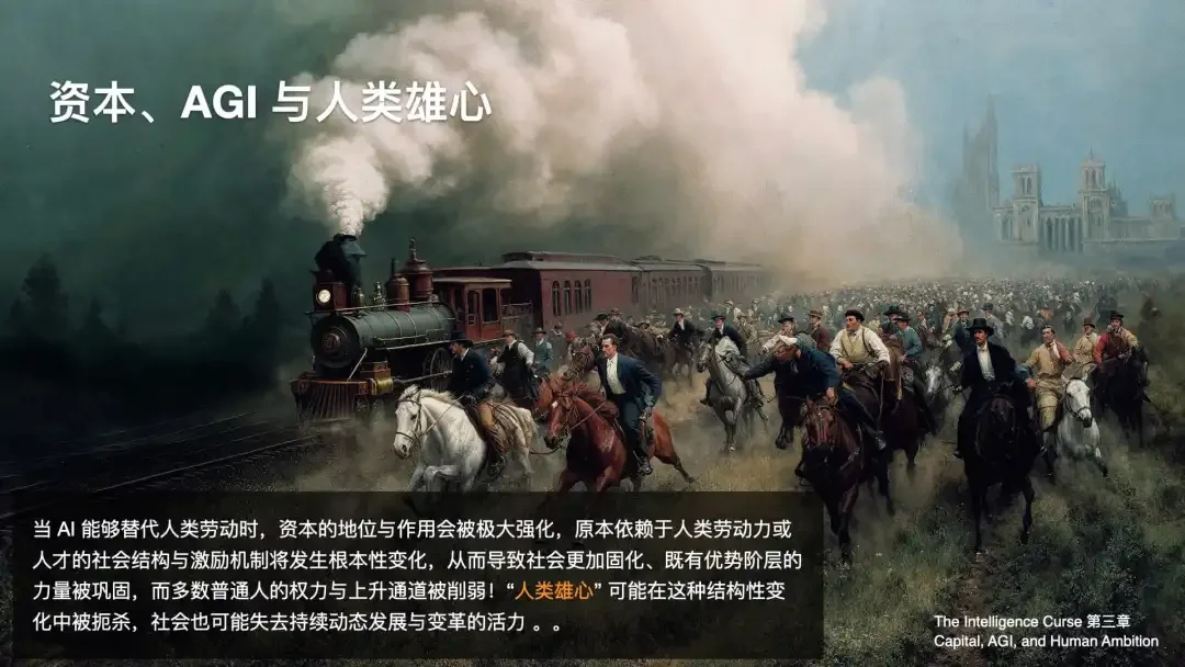 当 AI 替代劳动力,资本的地位将被无限强化。AI 不用哄,不用发福利,不会罢工。这必然导致阶层固化和上升通道的堵死。未来,99% 的普通人将失去雄心,领着政府发的 UBI(全民基本收入),戴上 VR 头显,沉浸在数字世界里。