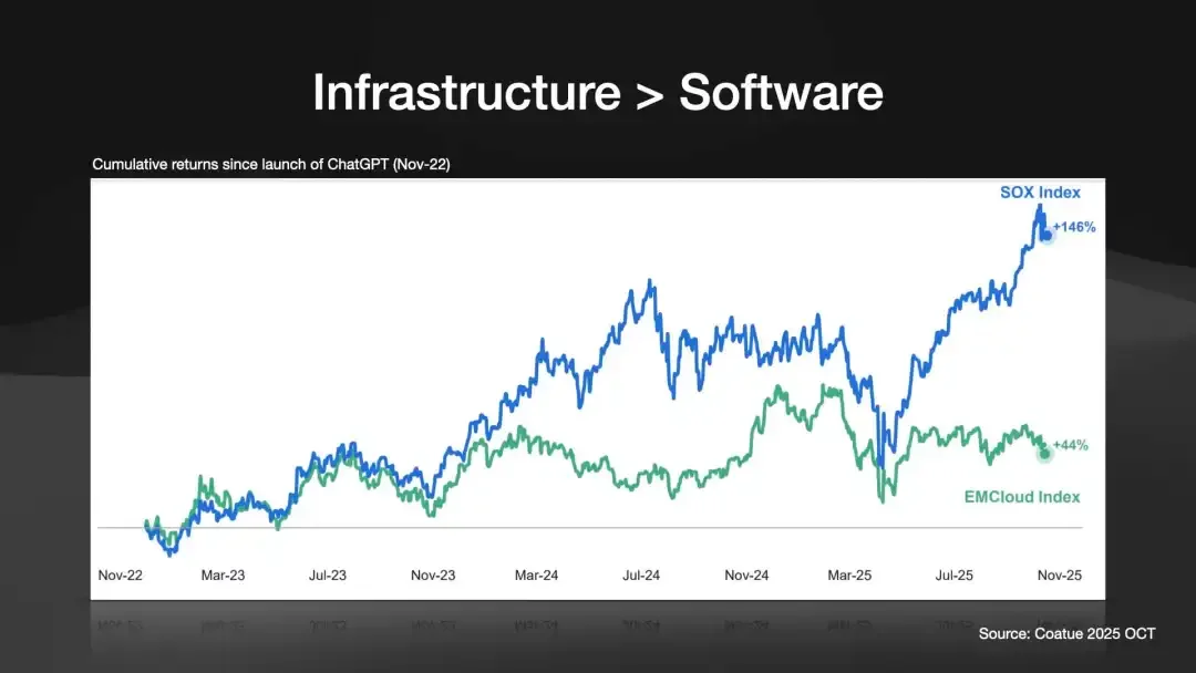 数据证明了这是对的。自 ChatGPT 发布以来,代表基建的“半导体指数 (SOX)”上涨了 146%,而代表软件的“云计算指数(EMCLOUD)”仅上涨了 44%。