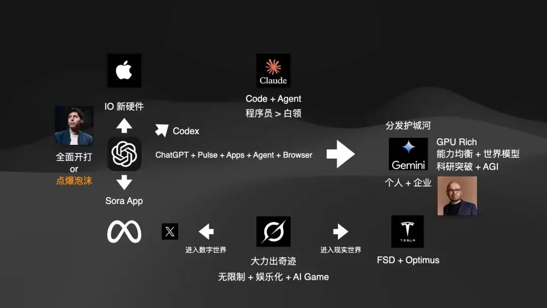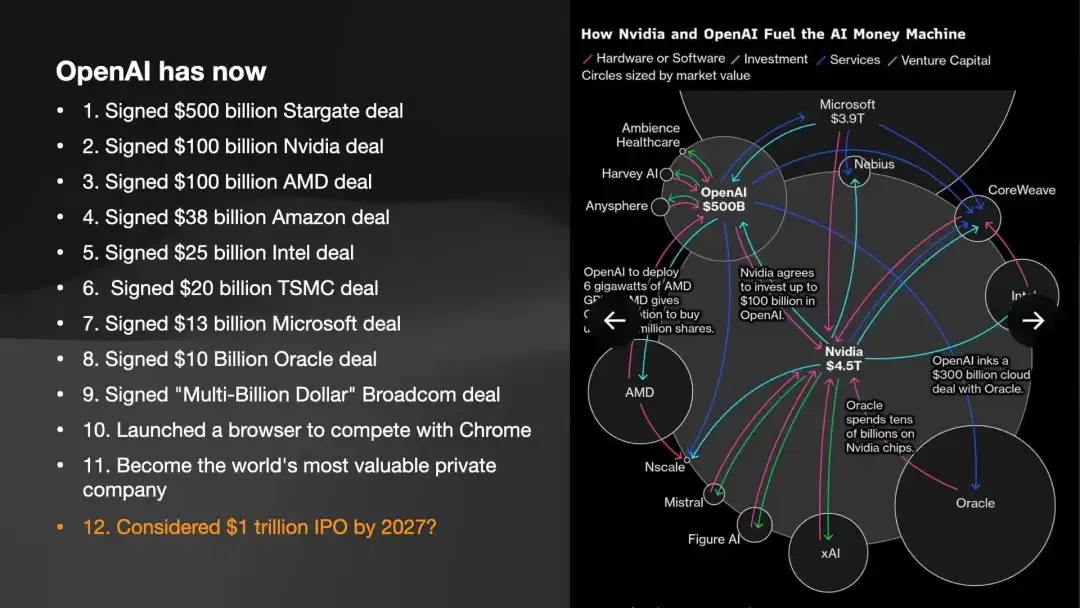 最后是 OpenAI。它在干什么?它在“全面开打”。它既要和 Google 打,也要和 Anthropic 打,还要和 xAI 打。它也是这场泡沫中负债最多的公司。那张错综复杂的万亿融资图谱,基本都是 Sam Altman 一个人签下的。要倒,也是他先倒。