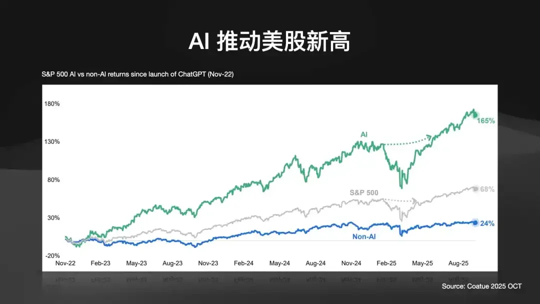 AI 正在真正推动美股创新高。自 2022年底以来,AI 相关股票平均上涨了165%,而与AI无关的股票仅上涨了 24%。