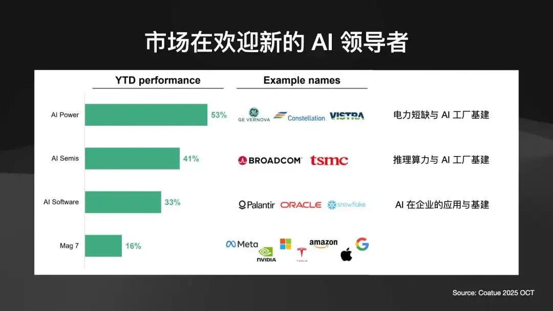 • 在 2025 年,表现最好的是能源(AI 太耗电)和半导体(AI 工厂的砖块)。