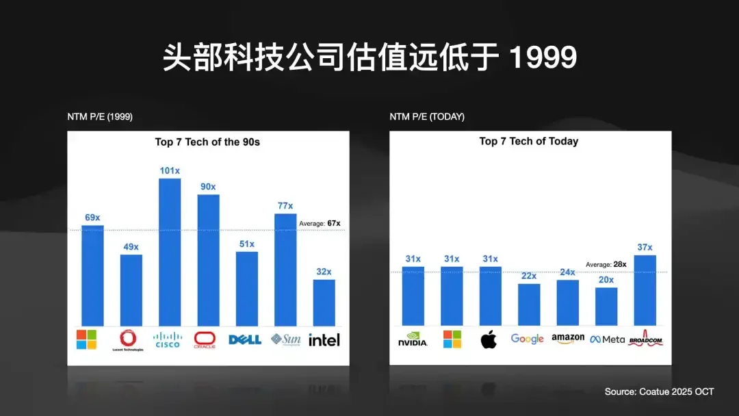 • 今天 (AI泡沫): 科技巨头的平均PE约 28 倍。