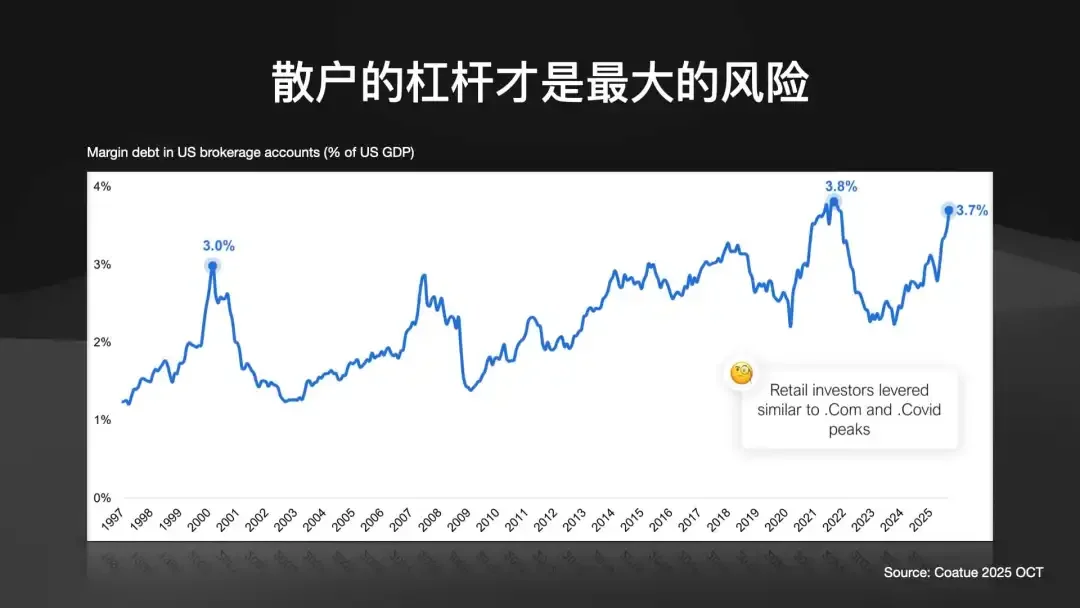 在散户的杠杆(Retail Investor Leverage)。今天的金融工具太先进了。2 倍、3 倍做多(或做空)的 ETF 层出不穷。你甚至可以买到 CoreWeave(一家 AI 基建公司)的 2 倍杠杆 ETF。