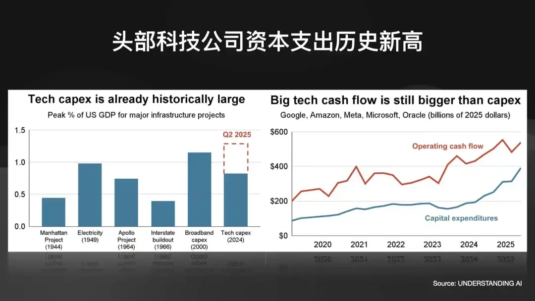 我们来看看科技巨头的资本支出(CapEx)。目前,科技巨头在AI上的支出已经达到了历史新高,超过了 .COM 时期,甚至超过了阿波罗登月计划的水平。