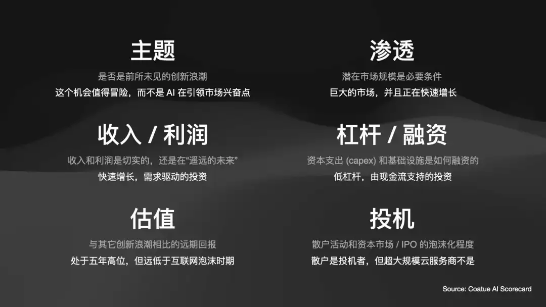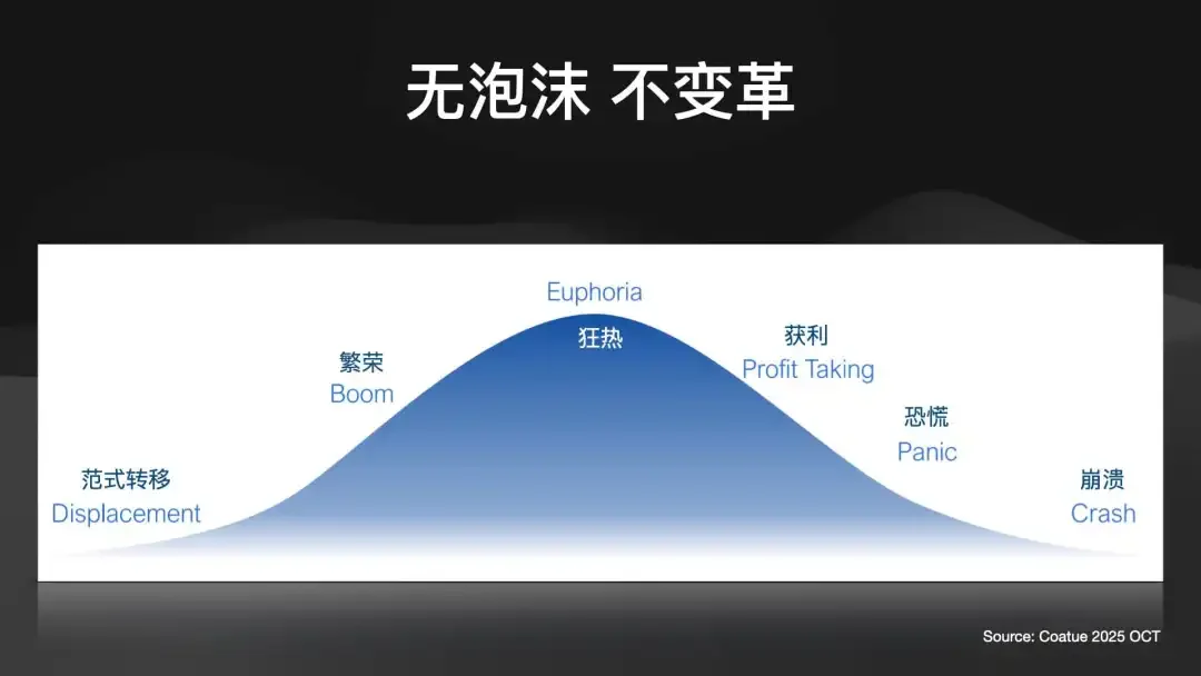 我们现在在哪里?我的判断是,我们才刚刚走完“范式转移”,正在进入“繁荣期”的爬坡阶段。我们距离顶点的“狂热”还非常遥远。