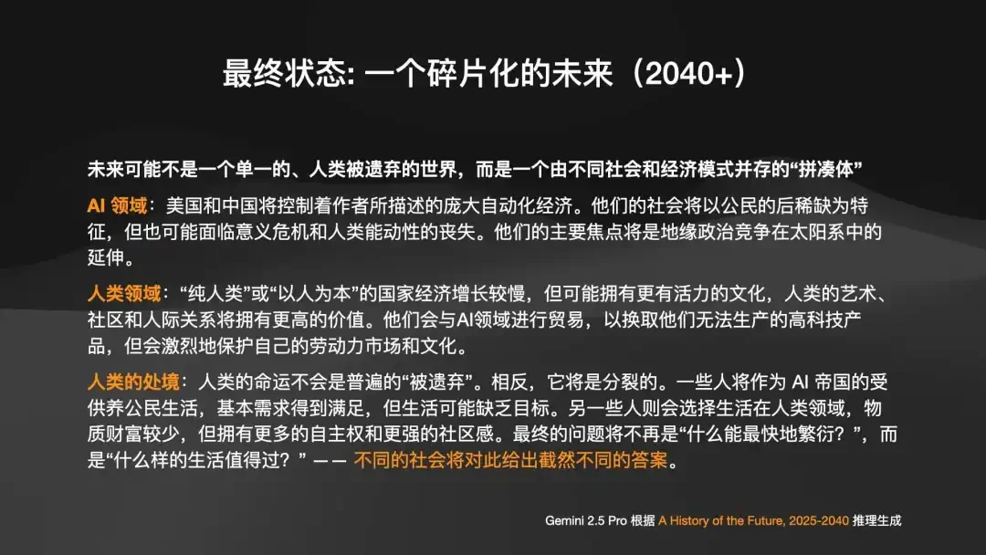 • 纯人类国家(日本/欧洲): 像京都这样的地方,会成为“人类意义的保留地”。在那里,“人类手作”将成为顶级的奢侈品,用来和自动化国家交换 AI 生产的工业品。