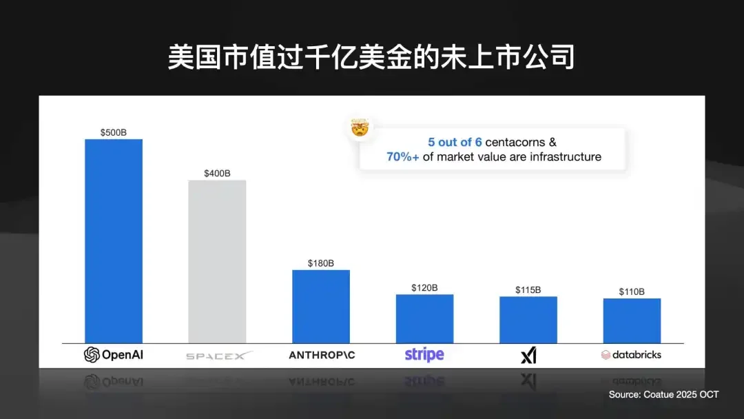 在私有市场(未上市公司)也是如此。估值最高的公司 —— OpenAI、Anthropic、xAI —— 全都是基建公司。就连马斯克的 SpaceX,做的也是“太空基建”,它的目标是把人类送入太空的成本,从天文数字降到每公斤 200 美元。