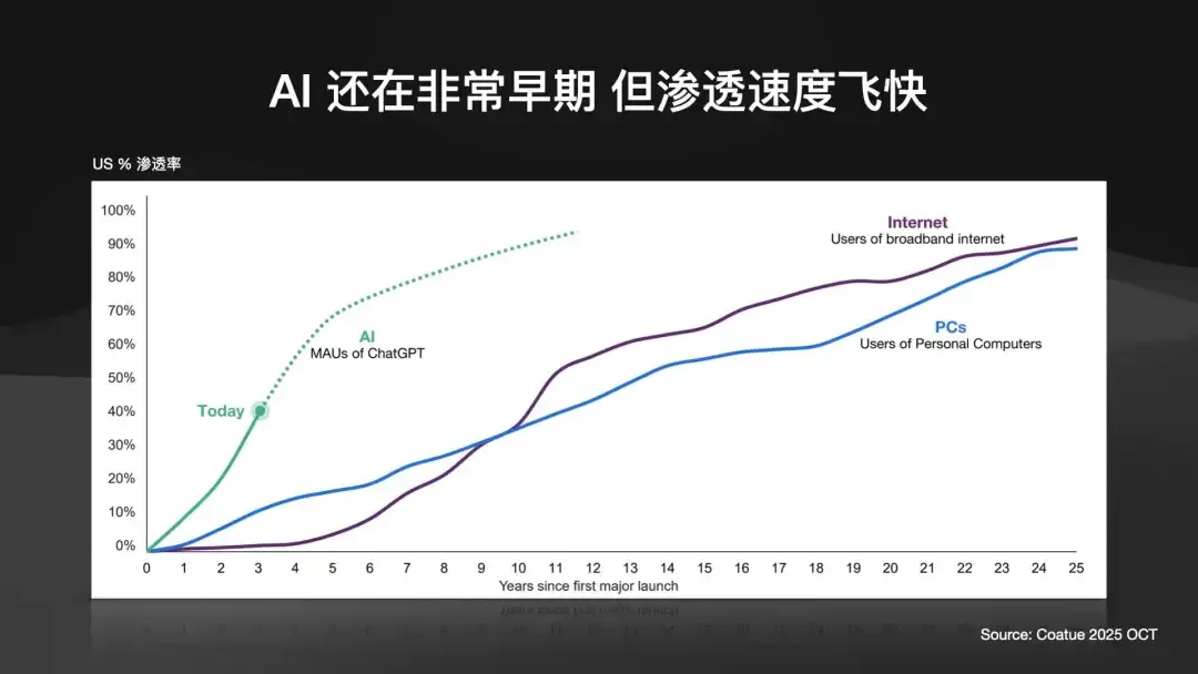 互联网和 PC,花了 20 多年,渗透率才达到 80% - 90%。而 AI,以ChatGPT 为例,只用了大约 3 年时间,在美国的 MAU(月活用户)渗透率就达到了 40%。