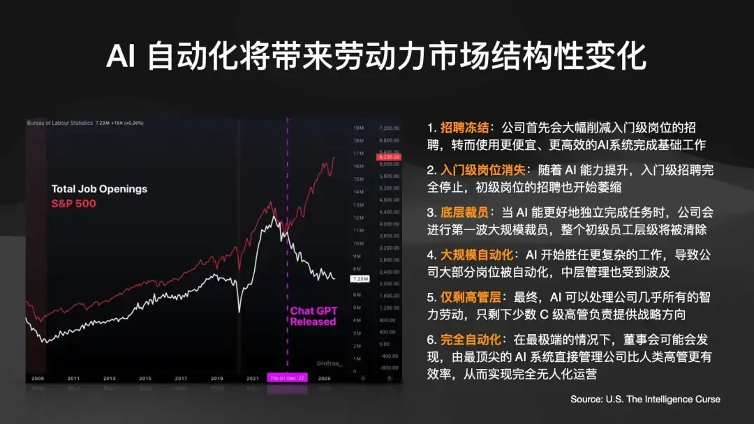 这种加速是有代价的。我们正在目睹“智能的诅咒”(Intelligent Curse)。最直观的图表:自ChatGPT 发布以来,美国的职位空缺(Job Openings)数量一路暴跌,而标普 500 指数却一路飙升。
